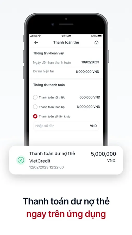 • Thanh toán khoản vay nhanh chóng ngay trên ứng dụng.