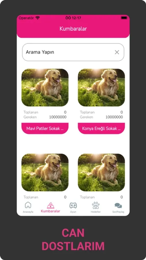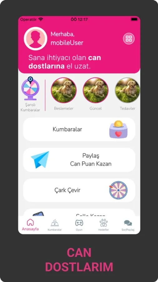 Can Dostlarım ; Sokaktaki Bakıma Muhtaç Canlarımızın Beslenme, Barınma ve Yaşam Haklarını Korumak İçin tüm sevenlerinin ve koruyucularının bir araya geldiği buluşma platformu ve sokak canlarımızı yaşatma projesidir. Can Dostu siz veya Can Dostlarım Kumbara sahibi olarak her gün özveriyle zaman ayırıp, sevgiyle emek verdiğiniz sokak canları başta olmak üzere tüm Canlar için aileniz, arkadaşlarınız ve destekçilerinizin sosyal medya gücü sayesinde eğlenerek ücret ödemeden mama gönderebilecek, önerilerinizi sorup/paylaşabilecek, dernek, vakıf ve belediyelerimizden yönlendirme ve yardım alabilecek, kayıp-sahiplendirme ilanı verebilecek, bloglarda faydalı yazılarınızı herkesle paylaşabilecek, tanıtıcı videolarınızı paylaşıp destekçilerinizi arttırabilecek ve interaktif iletişim kanalları sayesinde tüm Canlarımız için HEP BİRLİKTE OLMANIN GÜCÜNÜ HİSSEDEBİLECEĞİZ