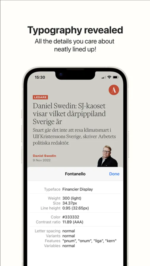 Fontanello reveals info about typeface, weight, size, line height, color, letter spacing, contrast ratio and variable font settings while you browse the web with Safari.