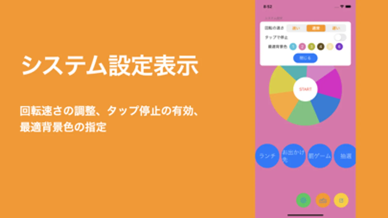 ・[タップで停止]が有効に設定された場合、再度、ワンタッチすると回転停止してランダム結果を表示する