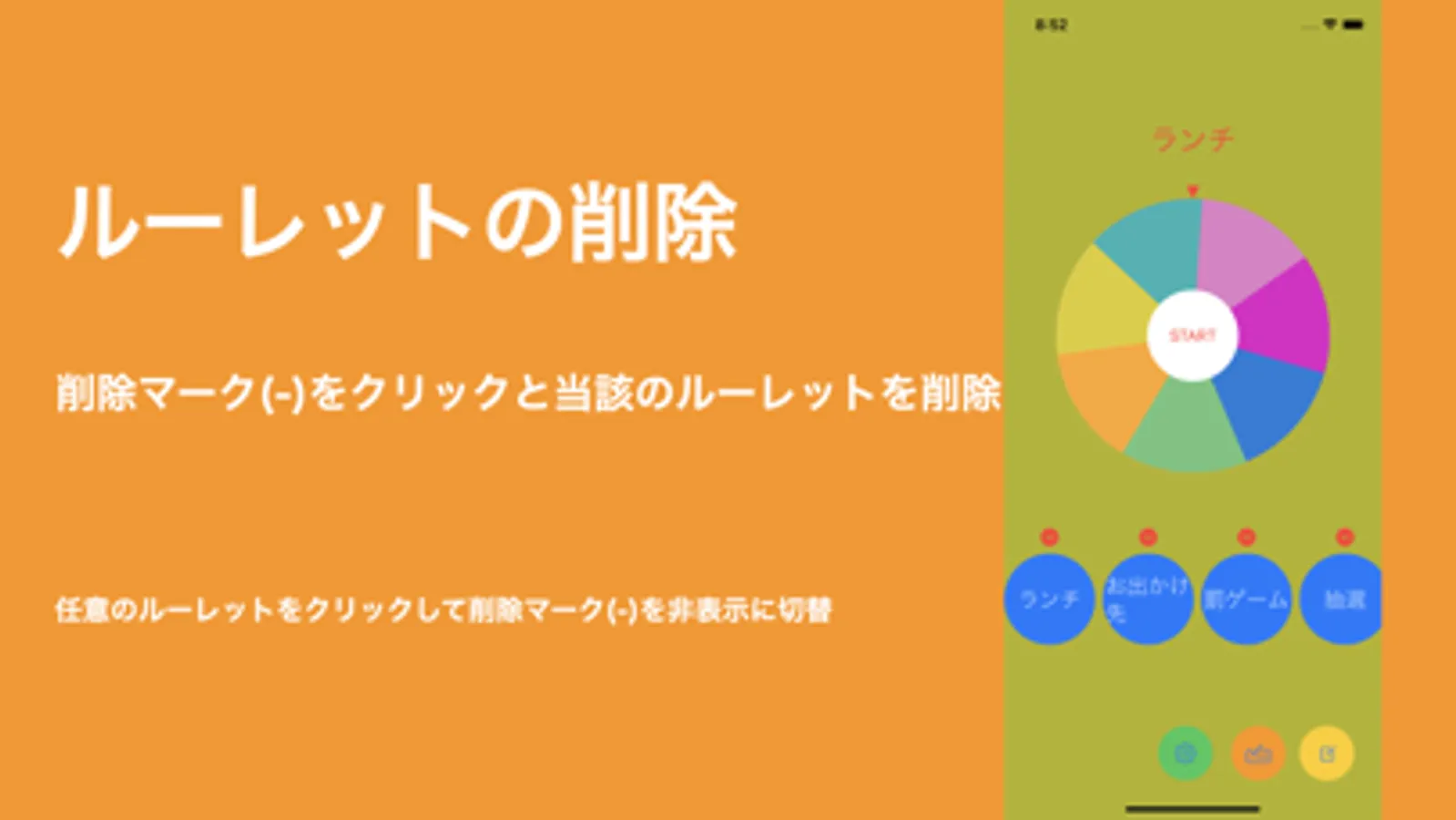 ・横並びに表示されているルーレット名に応じているボタンを長押しで削除ボタンを表示