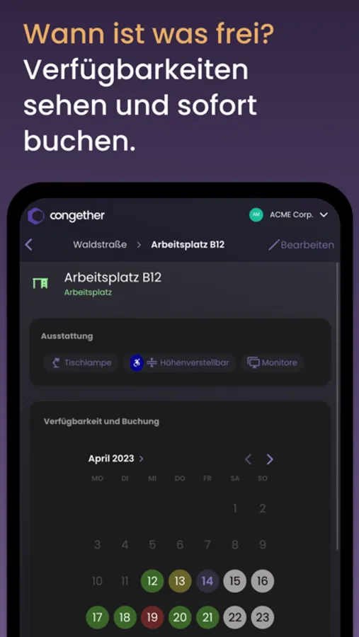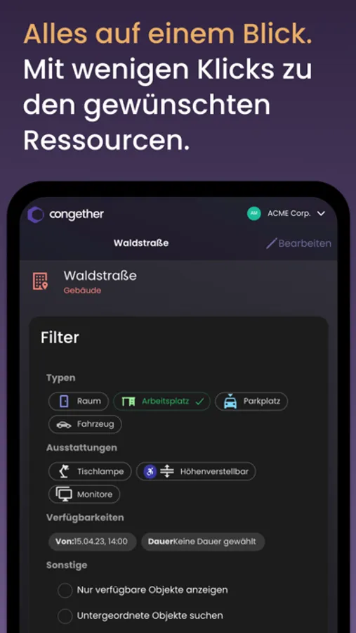 Optimieren Sie die Ressourcenverwaltung in Ihrem Unternehmen mit Congether und steigern Sie die Effizienz Ihrer Teams. Laden Sie die App jetzt herunter und starten Sie noch heute mit der Buchung von Ressourcen in nur wenigen einfachen Schritten!