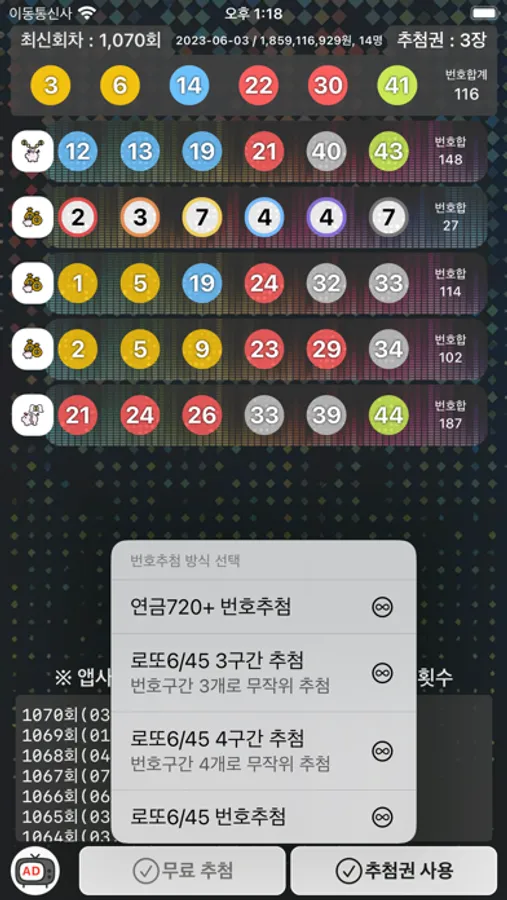 - 이 앱은 그동안의 한국내 로또645/연금720 당첨 결과를 이용하므로 타 국가에서 사용시 원하는 결과가 아닐 수 있습니다.