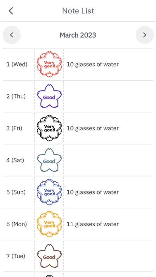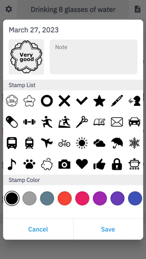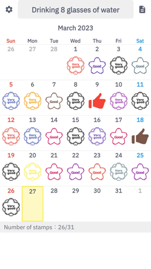 The app offers various types and colors of stamps. You can also input numerical values to track time spent studying or exercising. This app is versatile and can be used for a variety of purposes, such as studying, exercise, and hobbies.