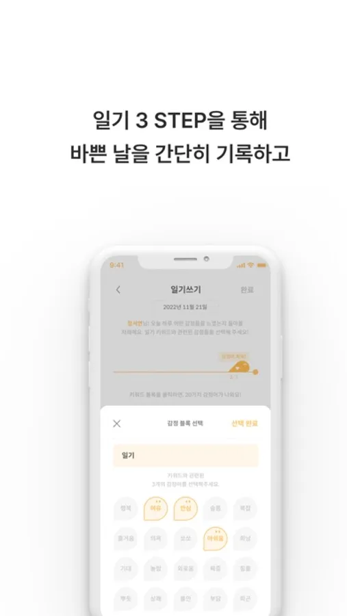 자유롭게 오늘 하루를 기록해보세요. 중요한 내용은 키워드로 만들어 하루를 구분하는 지표로 활용하고, 각각의 순간에 떠올랐던 감정을 선택할 수 있어요. 우리의 감정은 다채로우니까, 스무 개의 감정 선택지를 준비했어요.
