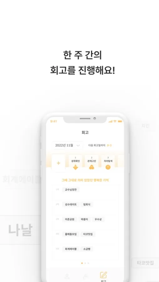 한 주를 채운 감정을 확인하고 '회고'를 통해 얻고 싶은 가치를 골라주세요. 매주 3개에서 5개의 질문에 답해보며 자신에게 몰입하는 경험을 가져보아요.
