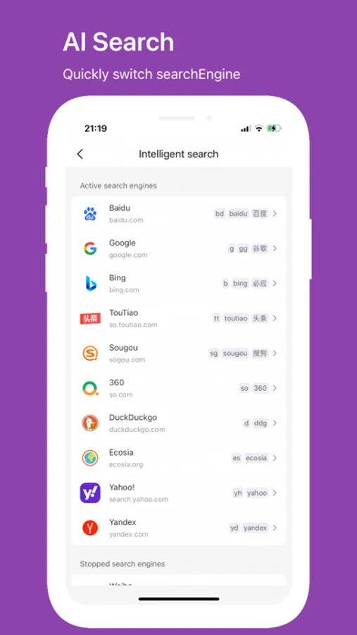 The smart search feature allows you to quickly switch Safari search engines by using [trigger word + space + keyword]. You don't need to manually change settings multiple times; it can be done with just one click.