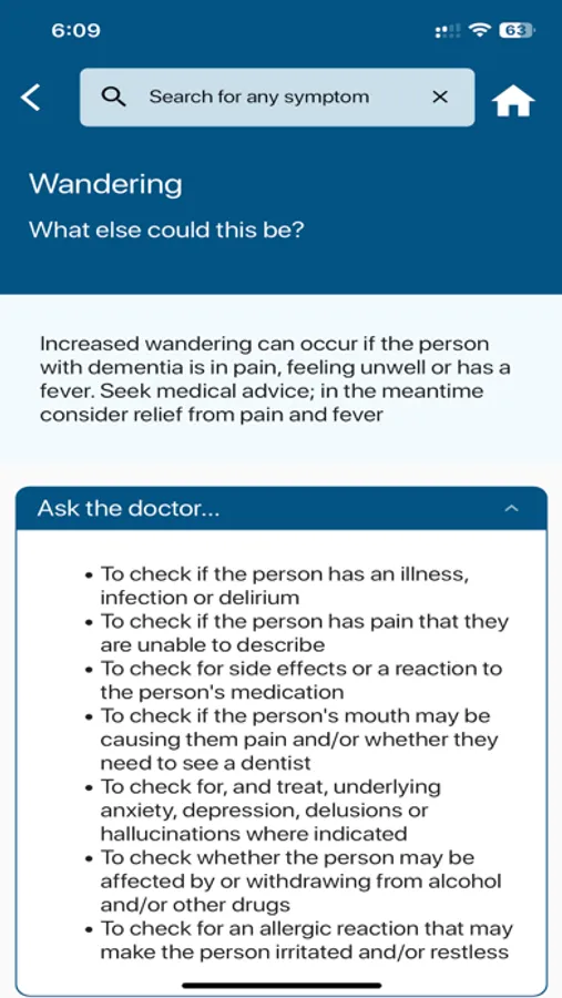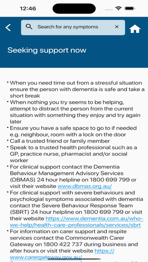 This app was developed to provide a quick reference guide which will assist carers when they are presented with behaviours and psychological symptoms associated with dementia. This app is provided for general information only and does not claim to reflect all considerations. As with all guidelines, recommendations may not be appropriate for use in all circumstances.