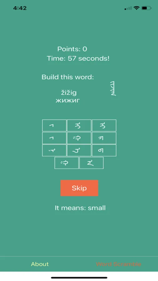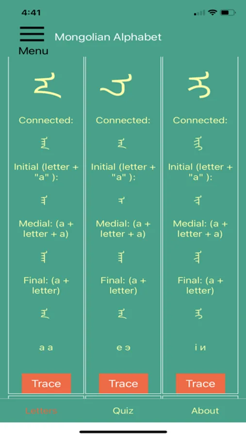 This app can help you get to know the Mongolian alphabet. Scroll through the letters and study their shapes and sounds. Practice tracing each one until you're familiar-- then quiz yourself on the letters!