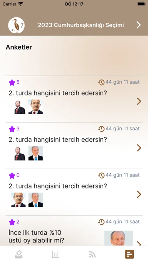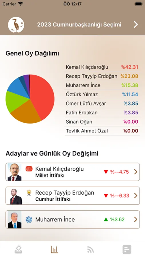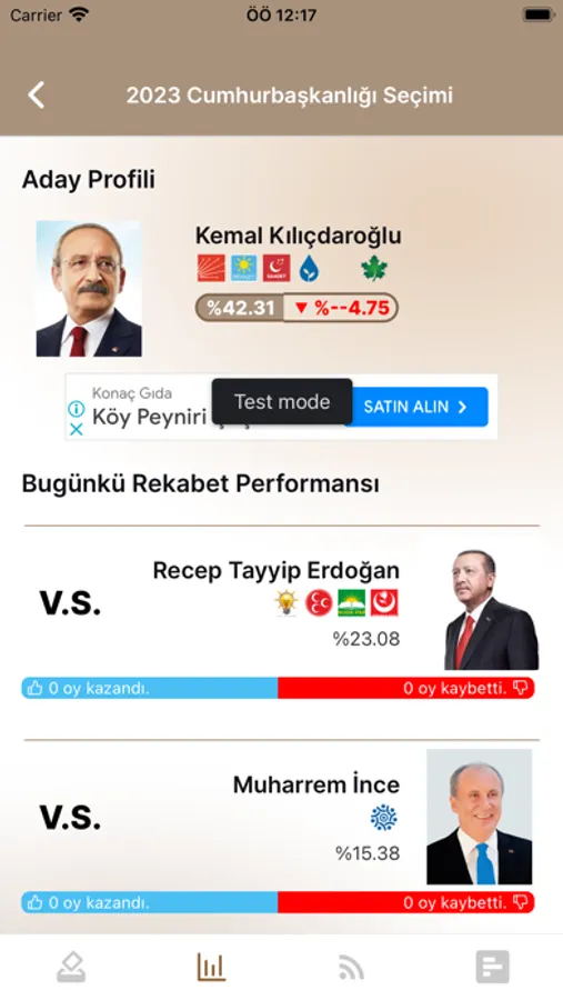 Siyasi ortamda adayların söz ve hareketleri kendisine o gün kaç oy kazandırmış - kaybettirmiş takip edebilirsiniz. Siz de fikrinizi değiştirip istatistiklere katkıda bulunabilirsiniz.