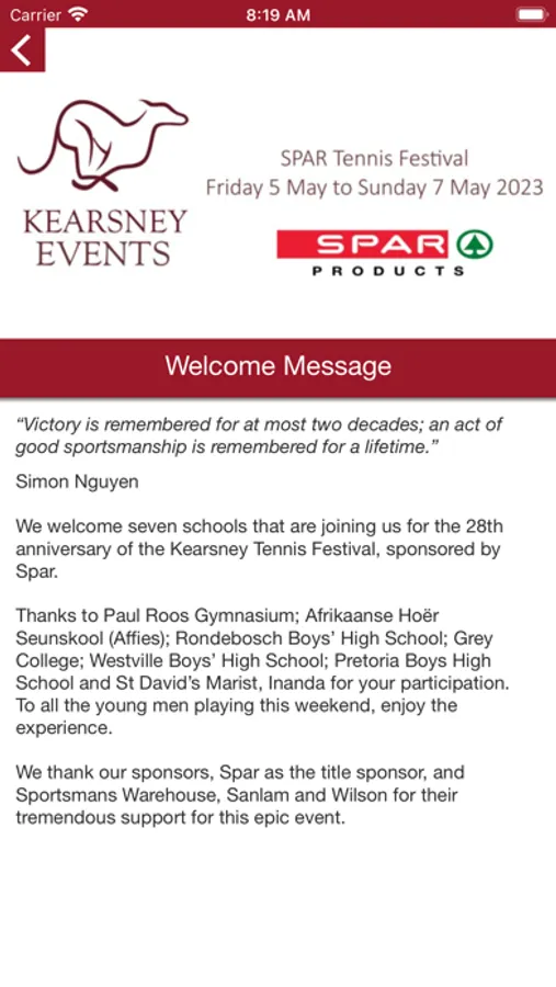Kearsney College hosts a number of events and festivals each year, attracting visitors to its beautiful campus. Use this app to stay informed about our events and festivals so that you don't miss any of them. The annual Kearsney Rugby Festival (KERF) is our flagship event, attracting thousands of visitors from around the country who visit to support the participating . Keep watching our app for other events later in the year too.