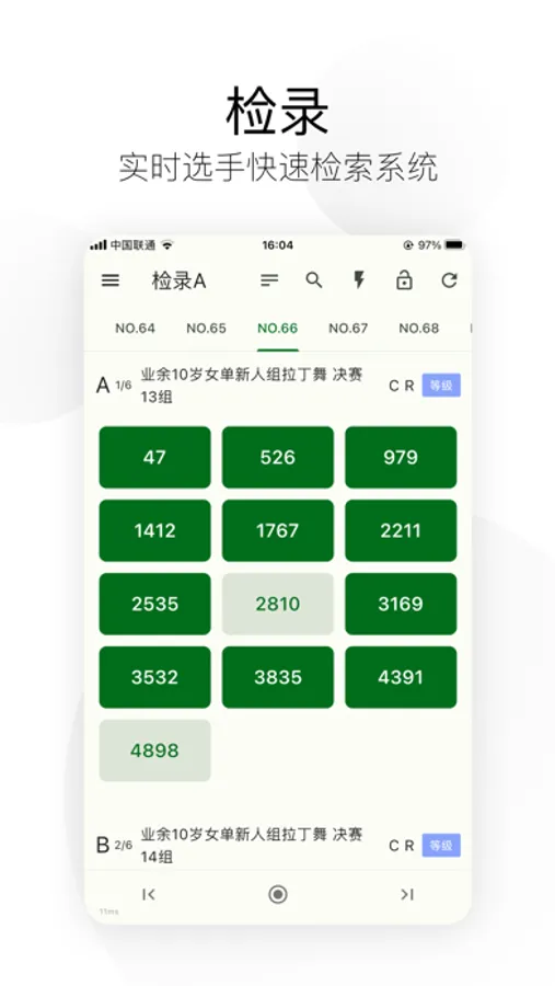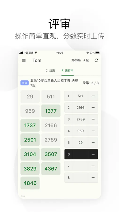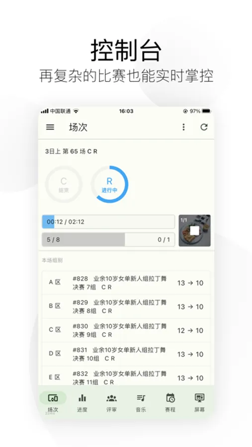 提供全套的舞蹈赛事解决方案: 评审打分系统、智能的检录系统、自动音乐播放系统、现场大屏幕展示、以及证书打印等多种功能,为您的赛事添光加彩。