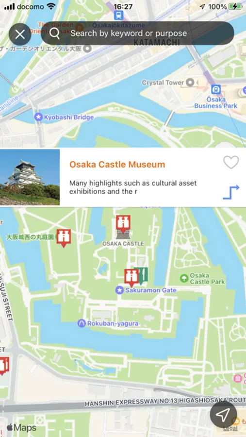 Once you found an event or a facility you are interested, it can provide the direction right there by taking you to the route search function. Also purchasing the """"Osaka e-Pass"""" which allows you to visit major sightseeing spots at discountted rates is so easy on the app. Booking sightseeing facilities and cultural experiences can also be done including credit card payment within the app.