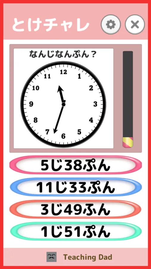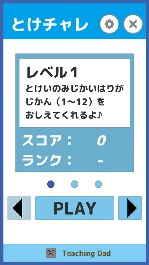 この教育アプリは時計を学習するためのアプリです。短針(1〜12)のみの簡単な問題から短針と長針(0〜59)を組み合わせた問題まで、自分のレベルに合わせて学習することができます。 正解率やタイム、スコア、ランクが表示されることで、学習意欲を促します。時計を覚えたい方、是非このアプリを試してみてください!