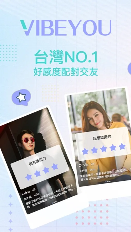準備好遇見與你心動的人了嗎?為尋求深度連結的用戶而設計,透過獨特的評分對象配對方式,VibeYou將幫助你找到與你有著共鳴的人,一起展開精彩約會之旅。