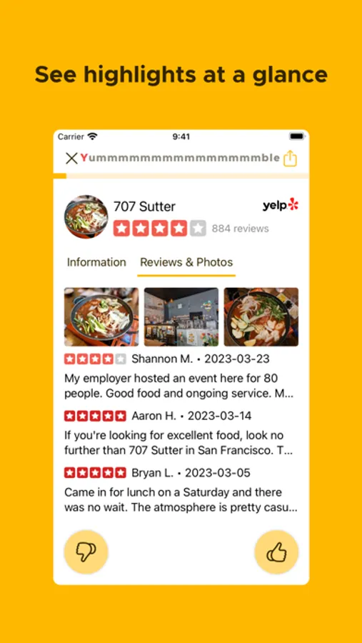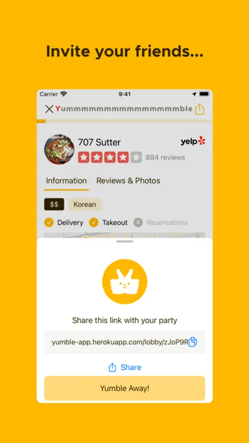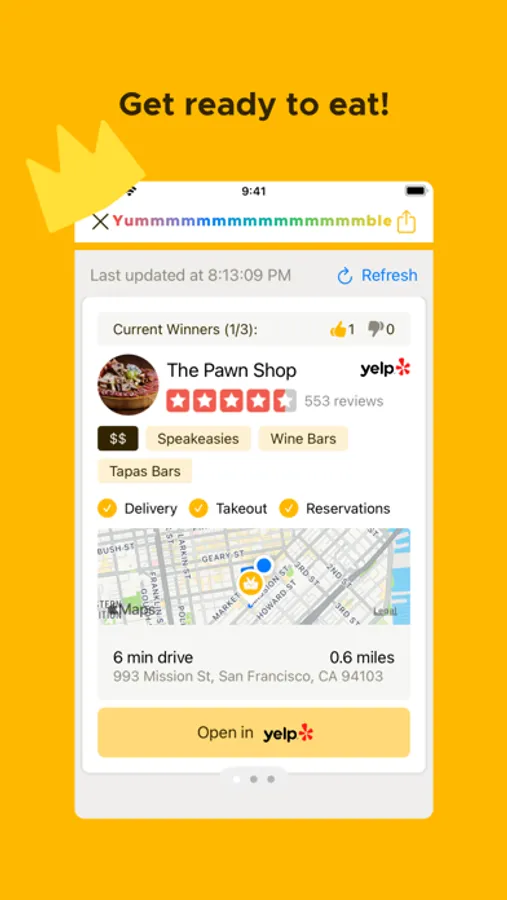 Say goodbye to the frustration of trying to decide where to eat with your friends. Download Yumble today and start making group decisions in just a few tippie-taps.
