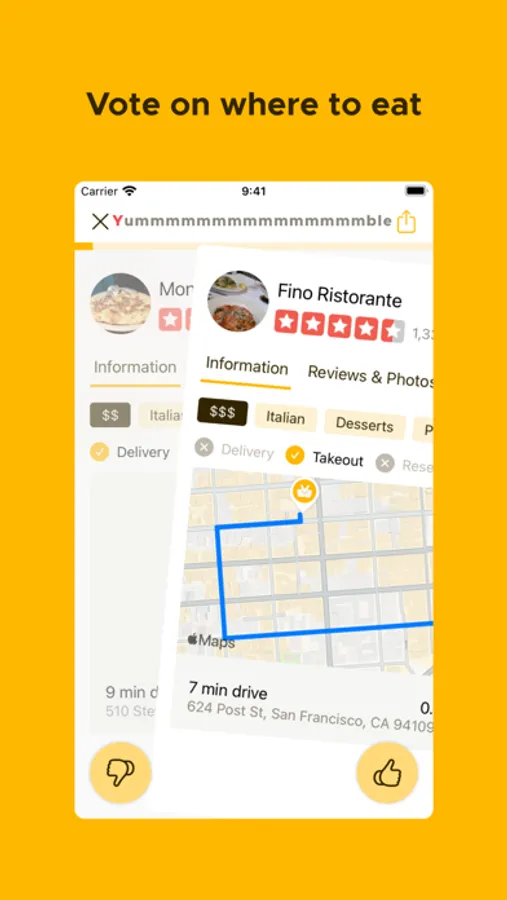 Can't decide where to eat‽ Yumble makes the decision-making process easy and fun by allowing everyone in the group to cast their vote and help determine where to go for your next meal.