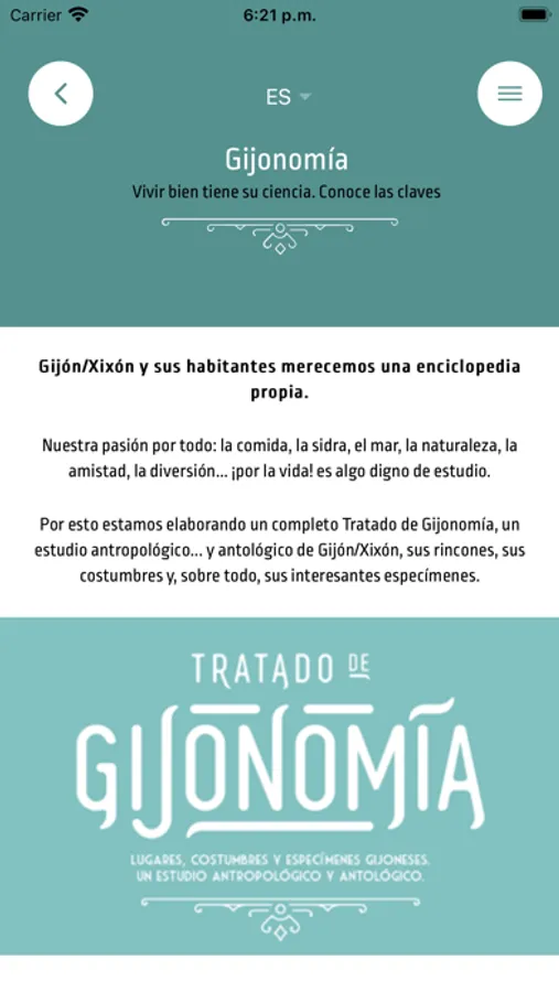 Tres son las secciones que ofrece esta guía de visita. En primer lugar, una presentación sobre el Tratado de Gijonomía. En este apartado descubrirás todo aquello que hace de esta ciudad un lugar muy especial. Dividido en varios principios se ilustrarán las claves para comprender lo que es la vida en Gijón/Xijón.