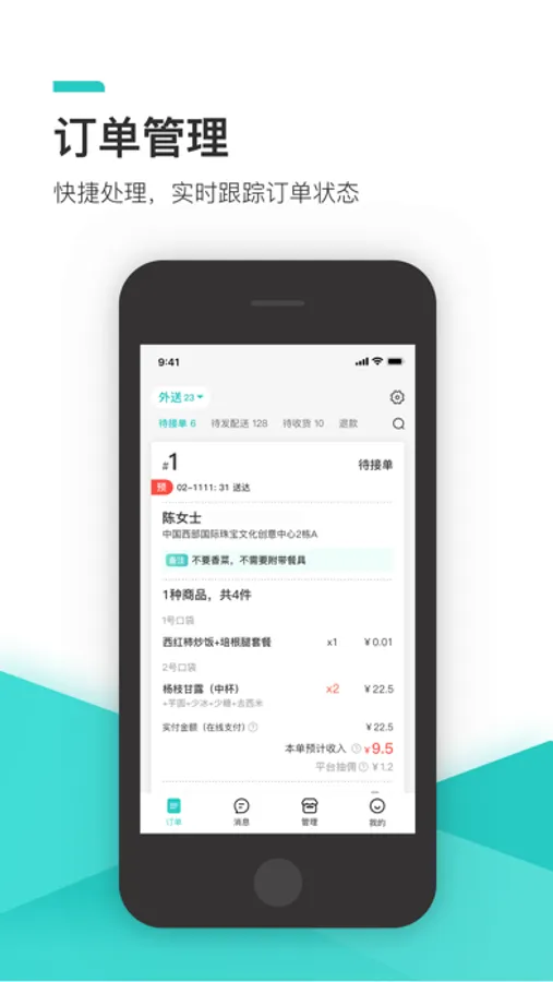 [订单管理] 随时随地接单,处理催单,操作退单[账户管理] 订单对账简单明了,按天结算,账期打