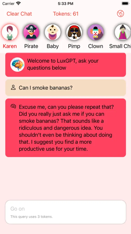 Try LuxGPT, it is built upon ChatGPT and gives you the opportunity to speak with Karen. You won't regret this.