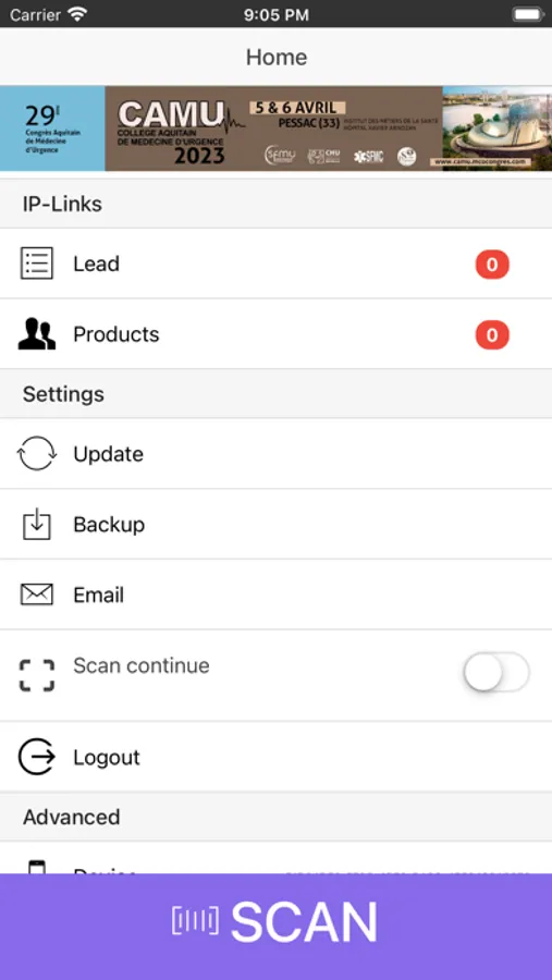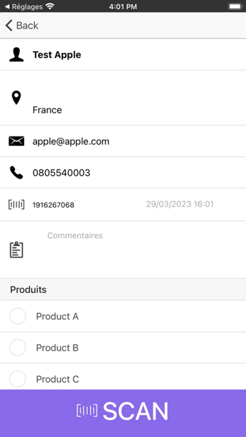 • Scan des codes barres / QR Code présents sur les badges. (et récupération des coordonnées des participants (adresse, téléphone, e-mail,...)).
