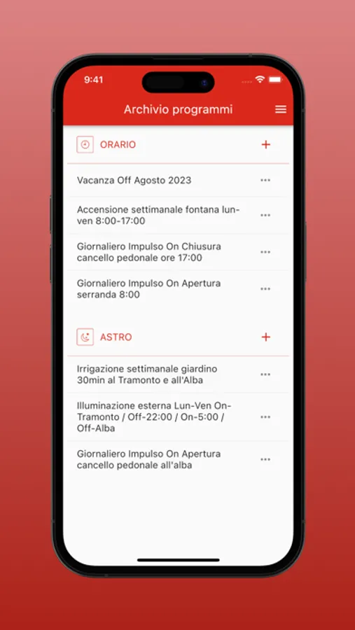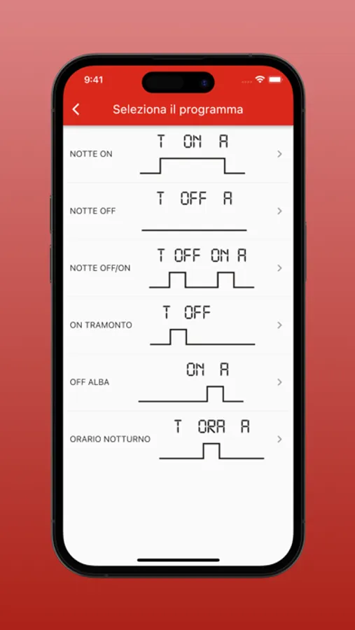 · Utilizzare il relè in modalità "programma orario" per impostare accensioni e spegnimenti in base a orari predefiniti nell'arco delle 24 ore, oppure in modalità "programma astronomico" per accensioni e spegnimenti notturni tra il momento del tramonto e quello dell'alba.