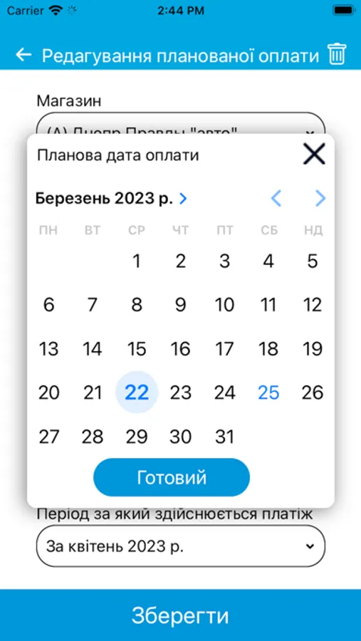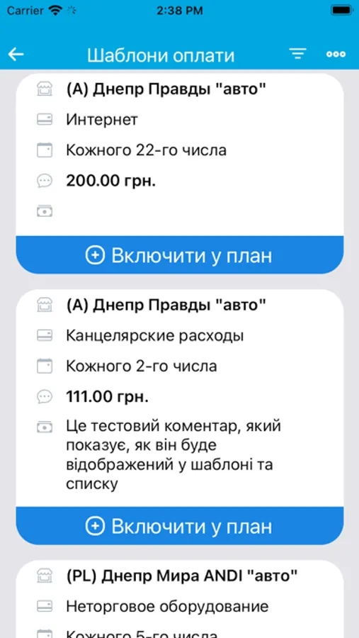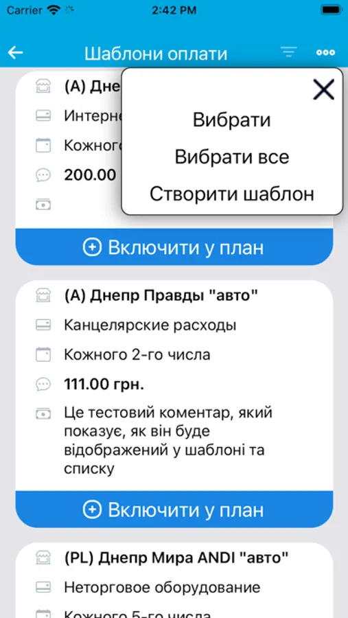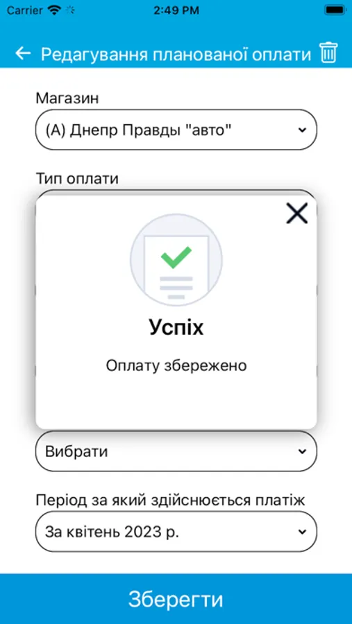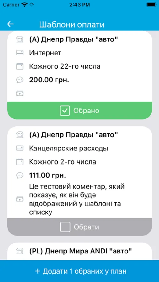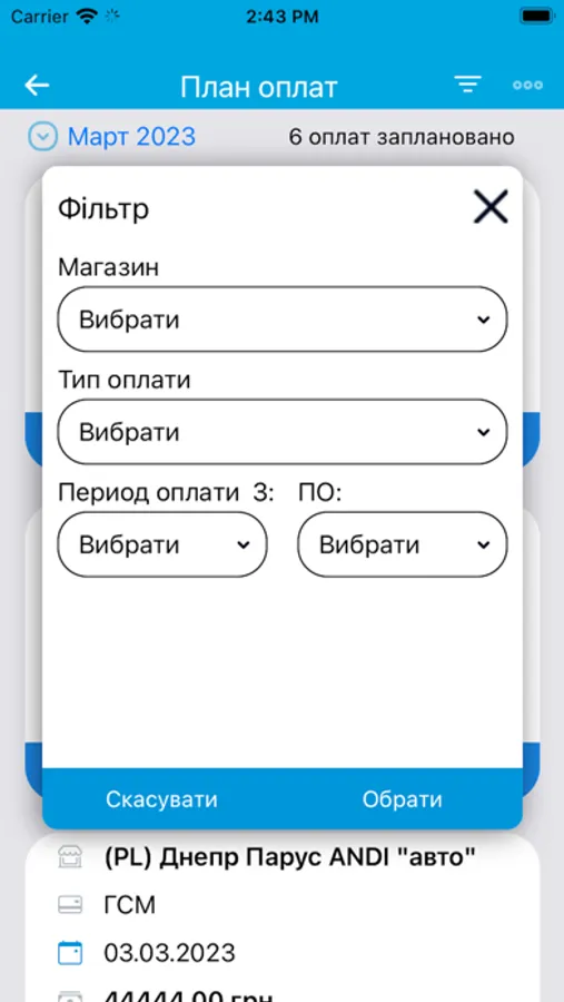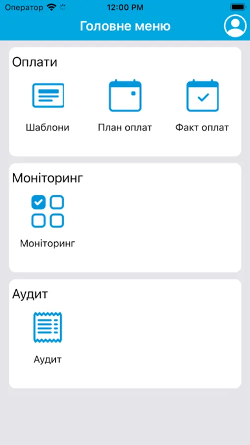 На цьому етапі додаток призначений для автоматизації процесу планування та обліку платежів торгових точок компанії. Він дозволяє формувати шаблони оплат, календар оплат і вносити факт з передачею підтверджуючих документів для аналізу та обробки в центральному офісі.