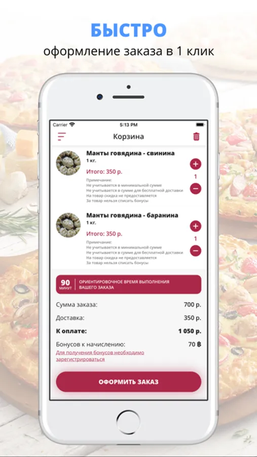 Установи приложение, выбери любимые блюда из нашего меню и оформи заказ всего в несколько кликов! С помощью мобильного приложения сможешь получать и копить бонусы, отслеживать статус заказа, выбрать удобный способ оплаты и быть в курсе всех акций и новостей.