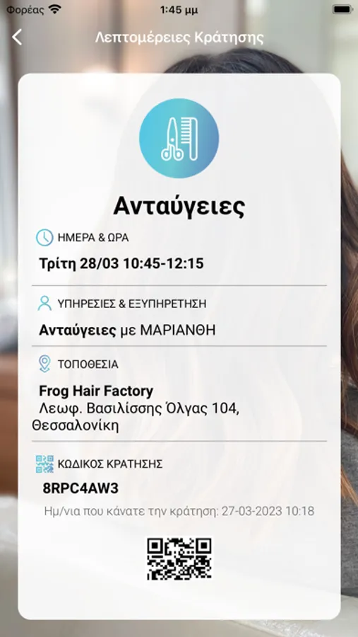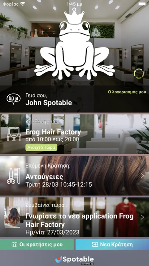 Εφαρμογή κρατήσεων για το Frog HairFactory! Κάντε τώρα εύκολα την κράτηση σας επιλέγοντας τις υπηρεσίες μας και το προσωπικό που θέλετε να σας εξυπηρετήσει.