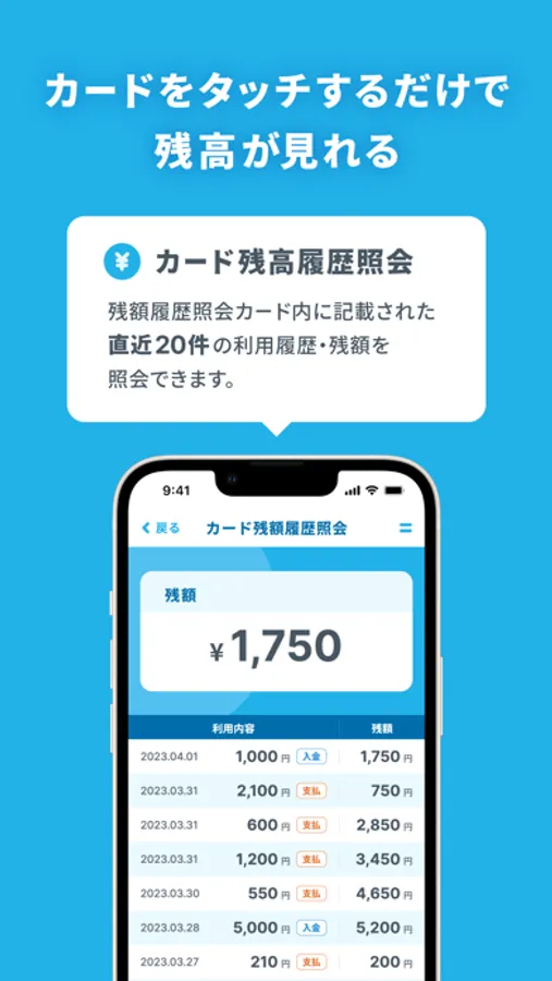 カードを読み取ることで、カード内に記録された直近20件の利用履歴・残額を照会できます。