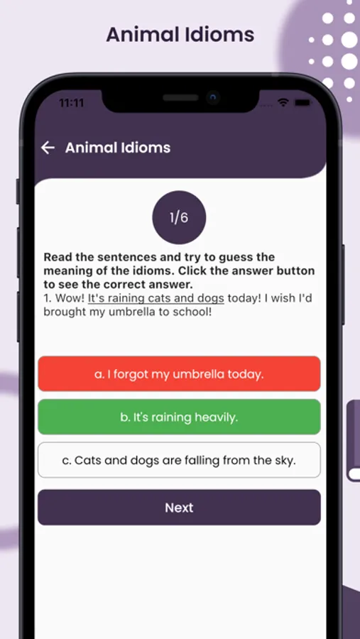 Quiz: The app features a quiz mode to test your knowledge of idioms and phrases.