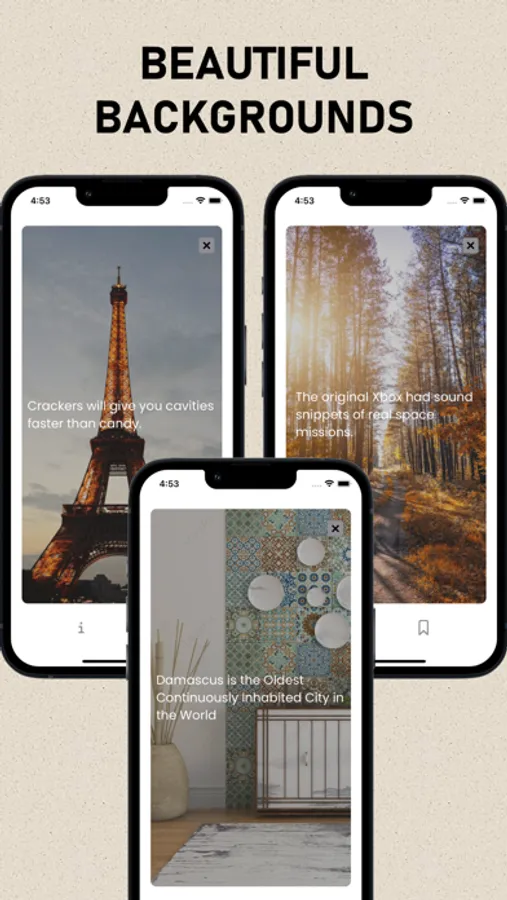 Read all the facts with beautiful images & background. You can explore each category or randomize all the categories. Be the go-to person in your workplace or school for all the unknown and amazing knowledge with this facts app