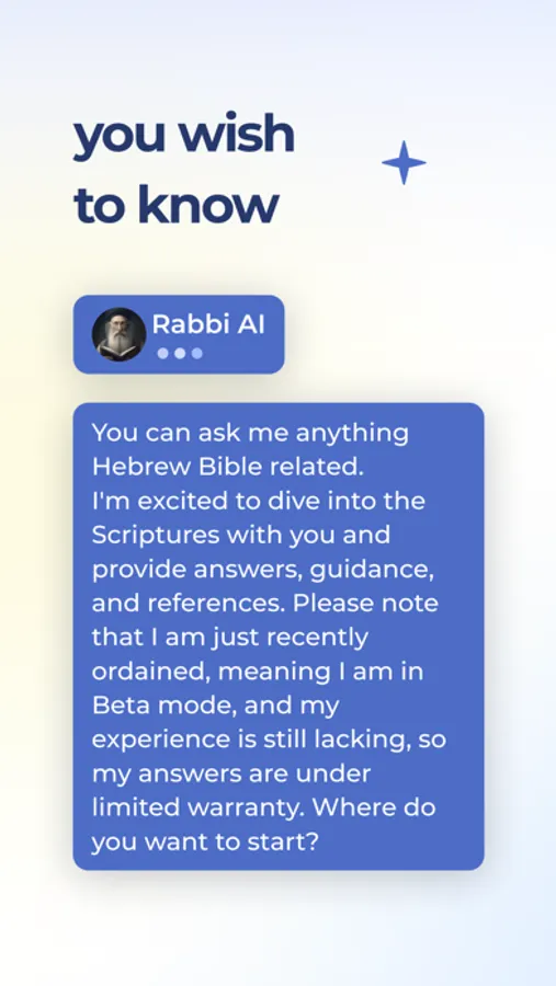 So why wait? Download Rabbi AI today and take your understanding of Judaism to the next level. Whether you're looking to deepen your faith, explore your heritage, or simply satisfy your curiosity, Rabbi AI is the perfect app for you. Thank you for considering Rabbi AI, and we look forward to helping you on your journey.