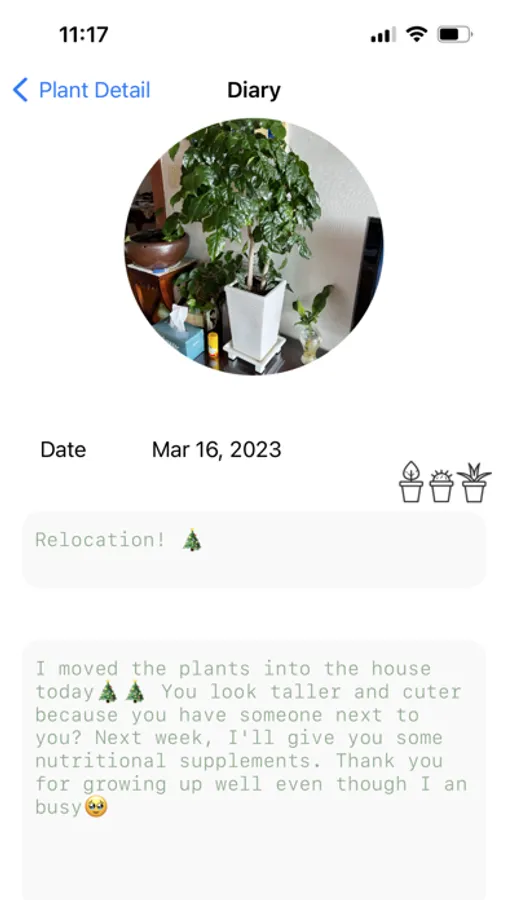 PlantWithJoy lets you keep track of your plant's progress by allowing you to write diaries for each plant!