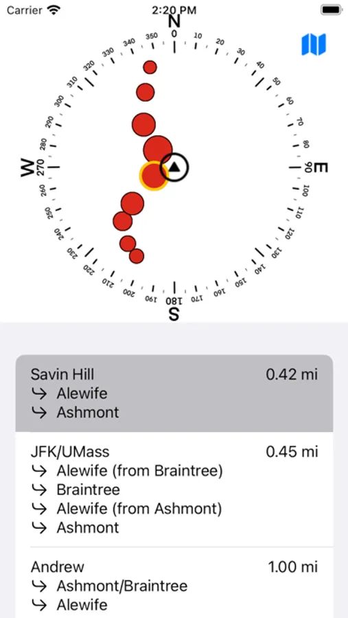 - Compass view : Nearby stops appear as blips on the screen and rotate around you as you turn. Approximate distances are depicted by size of blip and distance from center of view and are provided in the accompanying list of stops. Tap a stop in the list to select and highlight the corresponding blip.