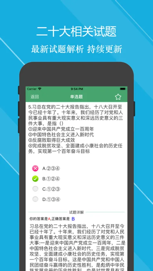 本软件是二十大题库软件,可随时随地学习练习,学习二十大必备神器!