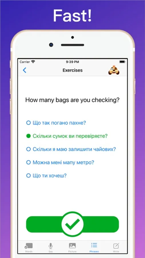Understanding Ukrainian is a good start but speaking is critical. Learn Ukrainian + provides advanced speech recognition to help you master pronunciation. Practice speaking at your own pace until you build the confidence to talk to others.