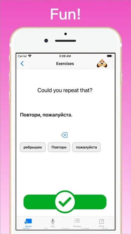 • Write Exercises teaches you to understand spoken words & write them correctly.
