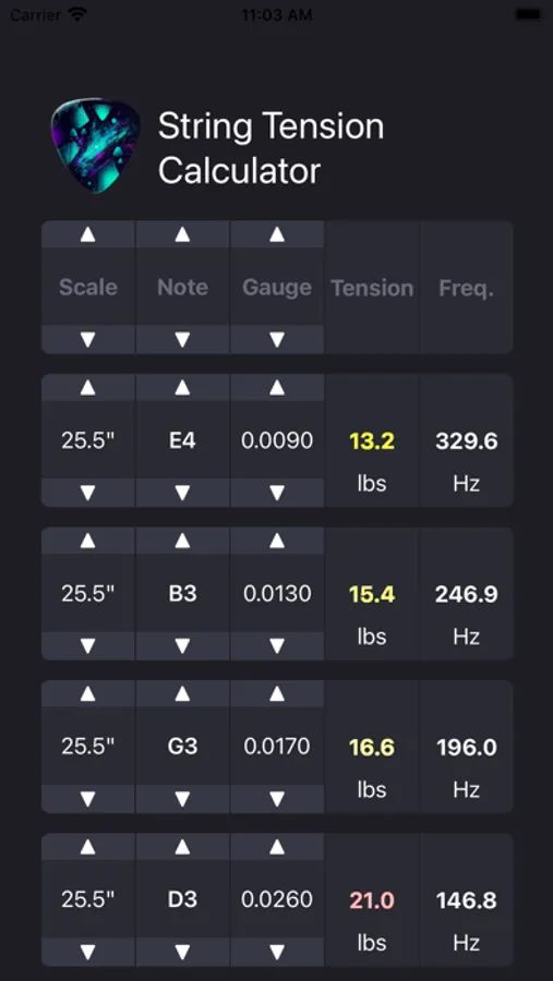 Our guitar string tension calculator app takes the guesswork out of tuning your guitar by providing precise tension calculations in pounds for each string. The app also includes a color-coded system, with "yellow" indicating light tension and "red" indicating heavy tension, making it easy to see the difference between strings. Plus, with the option to choose strings with the same tension, musicians with multiple instruments and tunings can quickly find the perfect string set to achieve consistent tension across all their guitars.