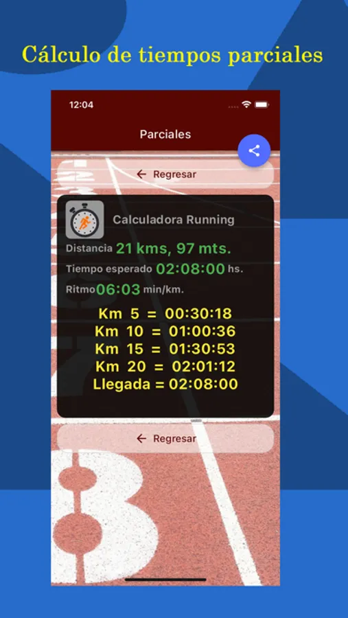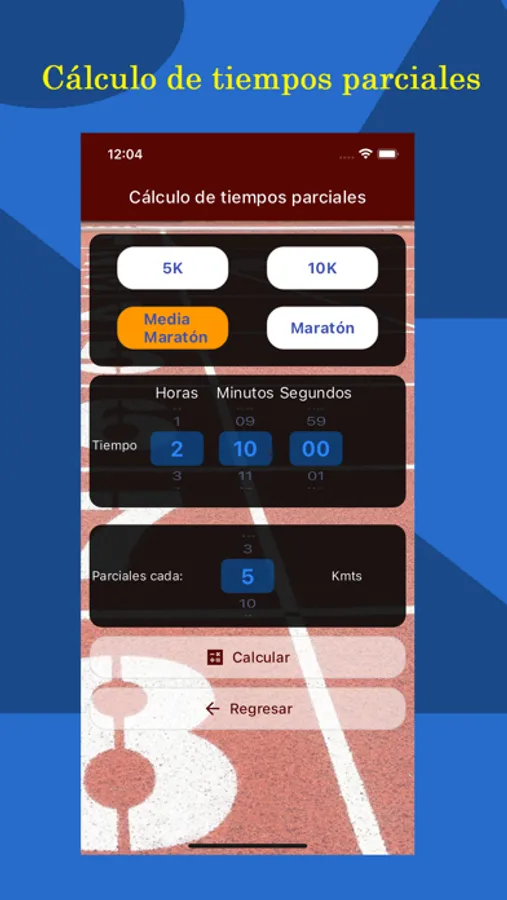Ingresando la distancia de carrera, el tiempo final esperado y el período de cada parcial (Cada 1 km, cada 5 km, etc) se mostrará el tiempo