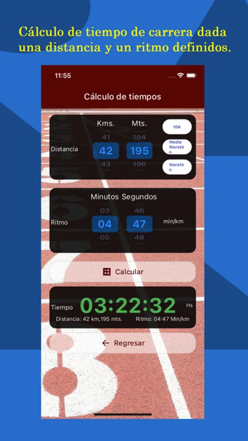 Simplemente seleccione la distancia (5k o 10K) e ingrese su mejor tiempo (hs min seg).