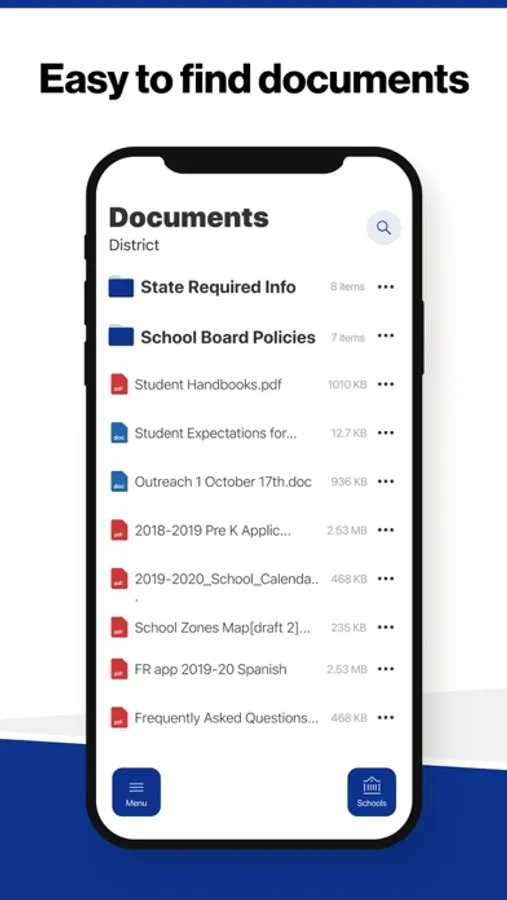 The event section shows a list of events throughout the district. Users can add an event to their calendar to share the event with friends and family with one tap.