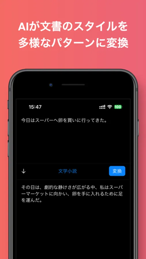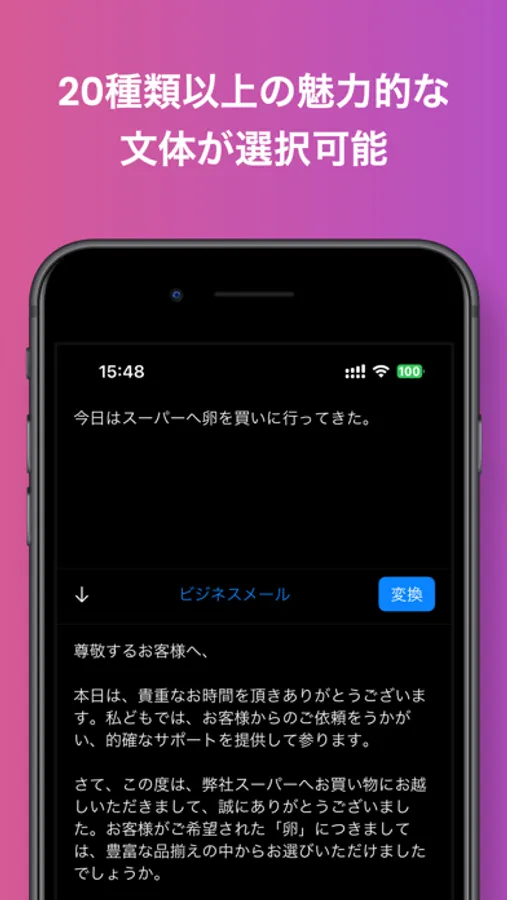 様々なシーンに対応した多彩な文体への変換が可能で、ビジネスからプライベートまで幅広く活用できます。