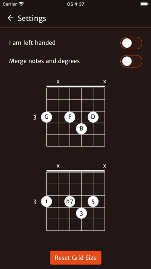 Two chord diagrams are shown for each chord. The above chord diagram shows the chord notes while the below diagram shows the degrees within the chord. This way you can form an understanding of the structure of each chord you practice and you can use this understanding to create other chords.