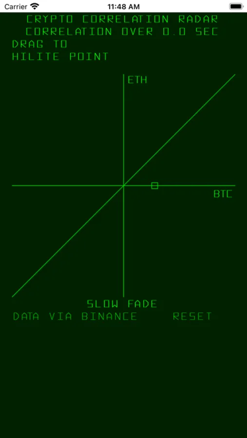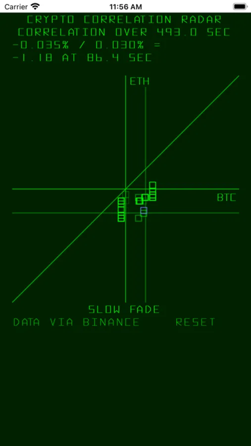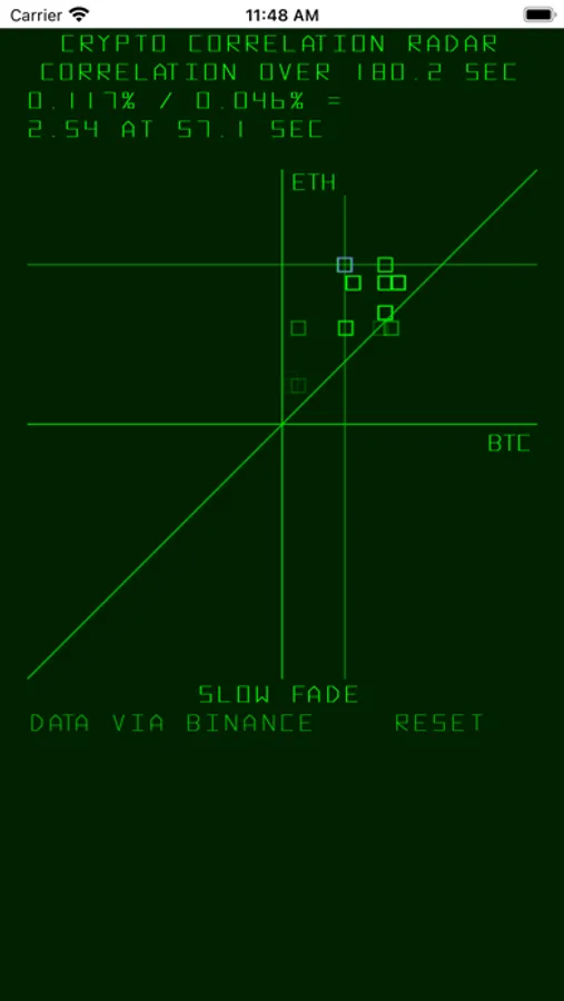 Visualize like it's 1975! If crypto currency was invented then, this is one way you might visualize it. Shows short term correlations or lack thereof between BTC and ETH streaming returns, which is a different view than the normal time series charts. Uses streaming data from Binance to compute % change of each asset since first data arrives after app launch, and shows these changes on an XY graph. Each point represents a pair of percentage changes referred back to app launch time (not since the last point). As such, newer points represent larger time deltas. The diagonal line represents perfect correlation which of course never occurs. Older points fade out. Shows time since first data point. Useful to show short term divergences in correlation between the assets. If more points from one asset stream into the app while the other asset's data stream is idle, we show all of the points, referring back to the constant coordinate. Since x and y data roll in separately from the stream, the x and y time stamps are not perfectly aligned, but we use the data we have available to get a best approximation of, as Marvin sang, what's goin' on.
