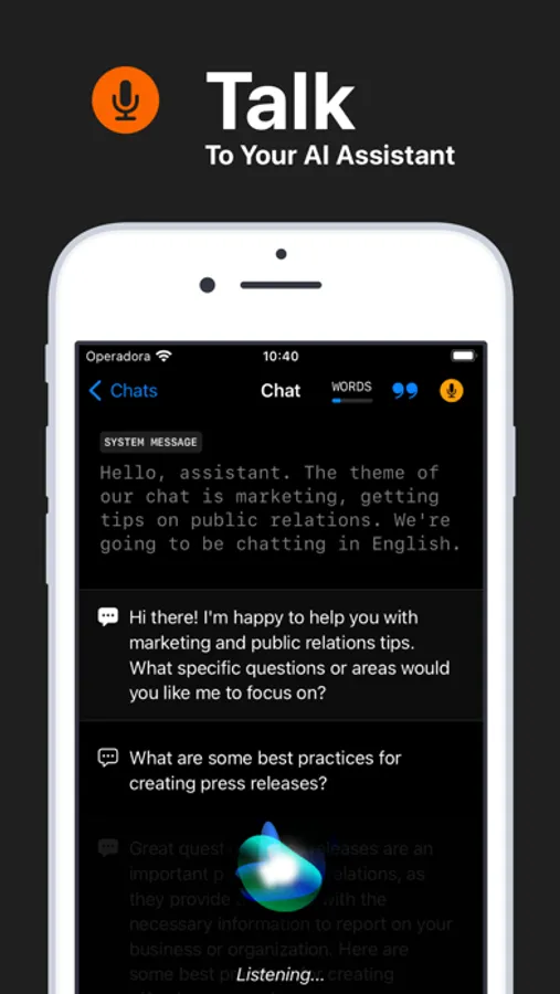 • Dynamic Conversations: Start conversations on the fly about any generic or specific topic, with options to type or speak and receive read-back replies from the assistant.