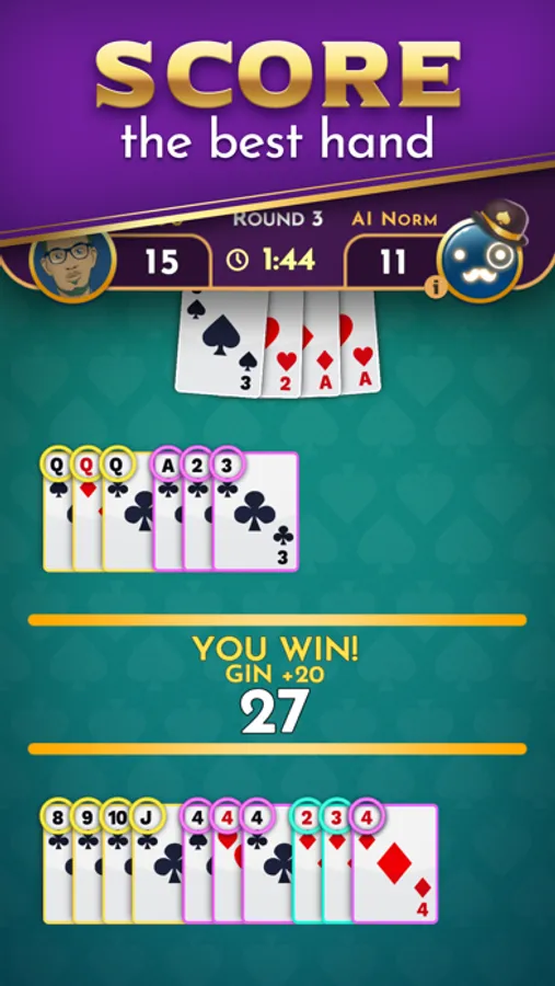 • Score bonuses if you can undercut your opponent or get a perfect Gin hand!