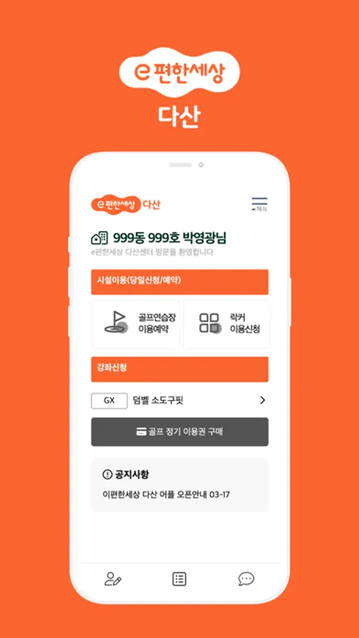 다산이편한세상에서 입주민들을 위해 제공하는 각종 시설 및 커뮤니티 시설을 이용할 수 있는 어플리케이션 서비스입니다. 각종 시설예약은 물론 관련 강습신청 등에 지원할 수 있는 서비스를 제공하고 있습니다. 다산이편한세상 입주민 여러분들의 많은 이용 부탁 드립니다.
