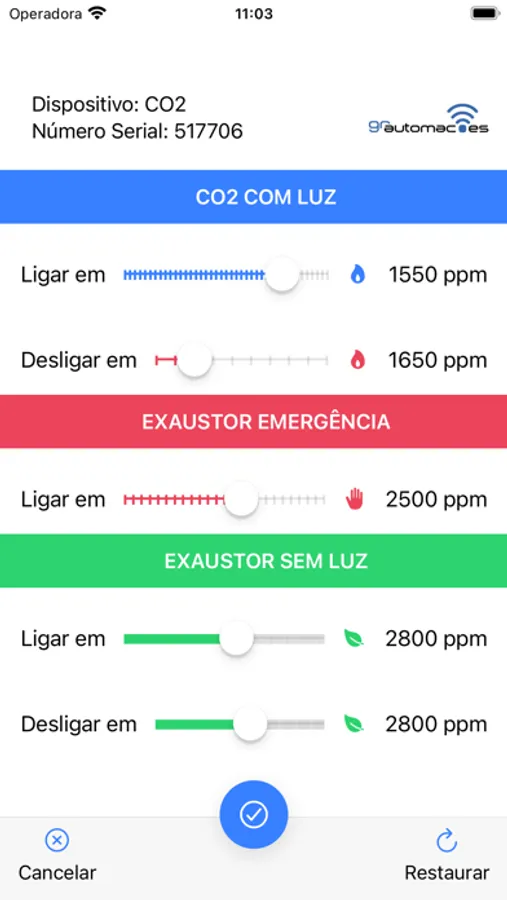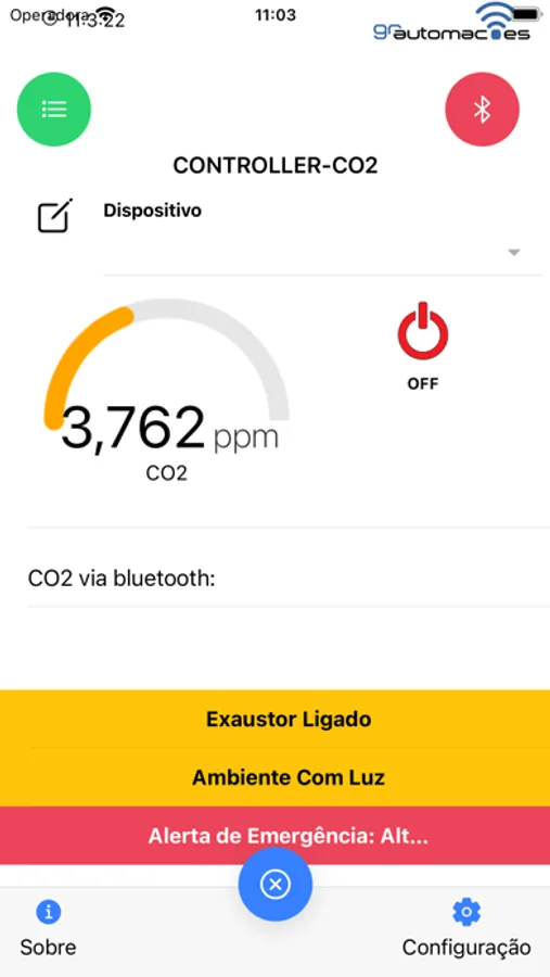O aplicativo, permite monitoração e conta com um histórico de eventos, além de recurso de configuração que controla o ppm de CO2 nas situações de luz, emergência e sem luz. Leitura em tempo real de ppm de CO2 via internet e bluetooth, monitora o status do exaustor e da válvula/gerador, além do ambiente se está com ou sem luz.