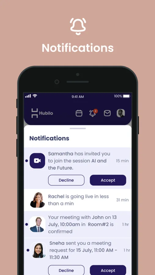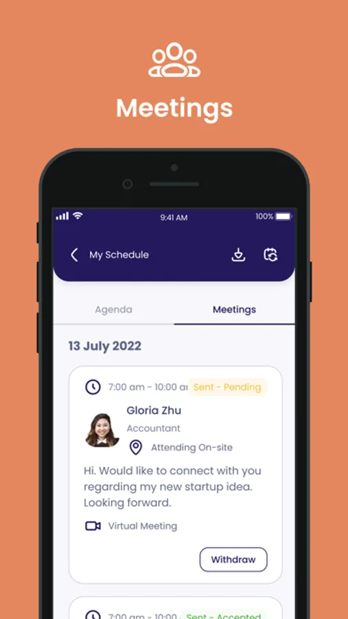 Your profile can be managed by clicking your photo (if uploaded) or the colored circle at the upper right corner of the app. Under the profile you can edit your profile information. Live participants can also access and display their QR code to check into the conference and share information with sponsors by clicking on their profile image.